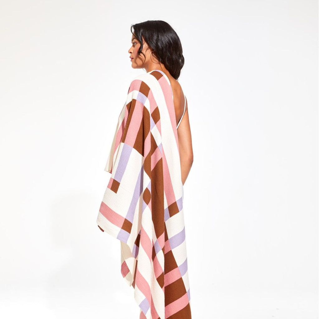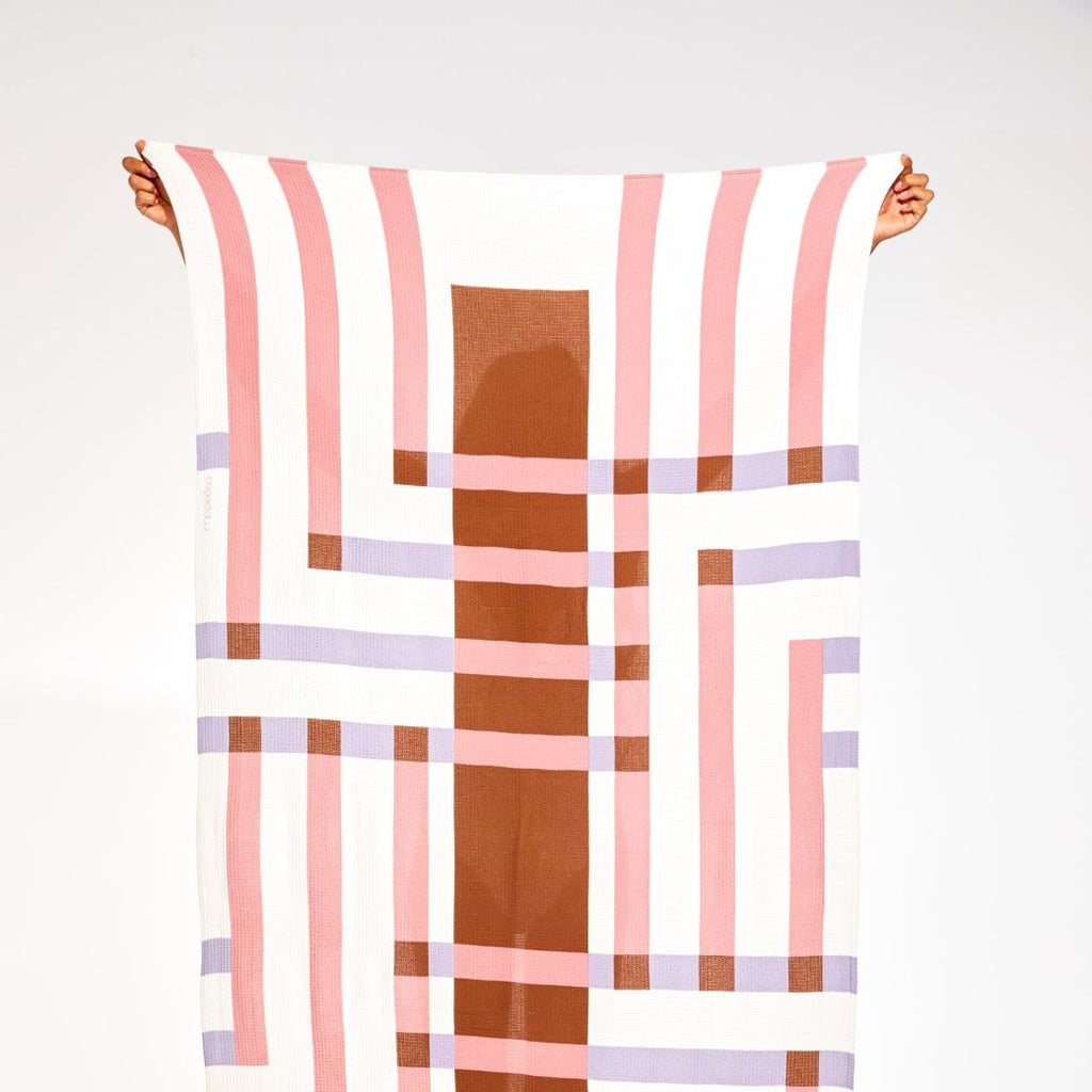 Drap de plage ou de bain en nid d'abeille imprimé.Les lignes strictes qui se croisent crées un réseau graphique et jeu de superposition de couleurs.100/200 cm100% Coton