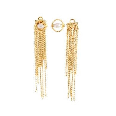 Ces boucles d'oreilles se portent de 2 façons. Vous pouvez porter uniquement l'avant avec la perle ou ajouter la cascade de chaînes à l'arrière de l'oreille en la passant dans la tige. Diamètre avant 0,8 cm. Perle d'eau douce 0,4 x 0,3 cm. Arrière 5 x 0,7 cm.