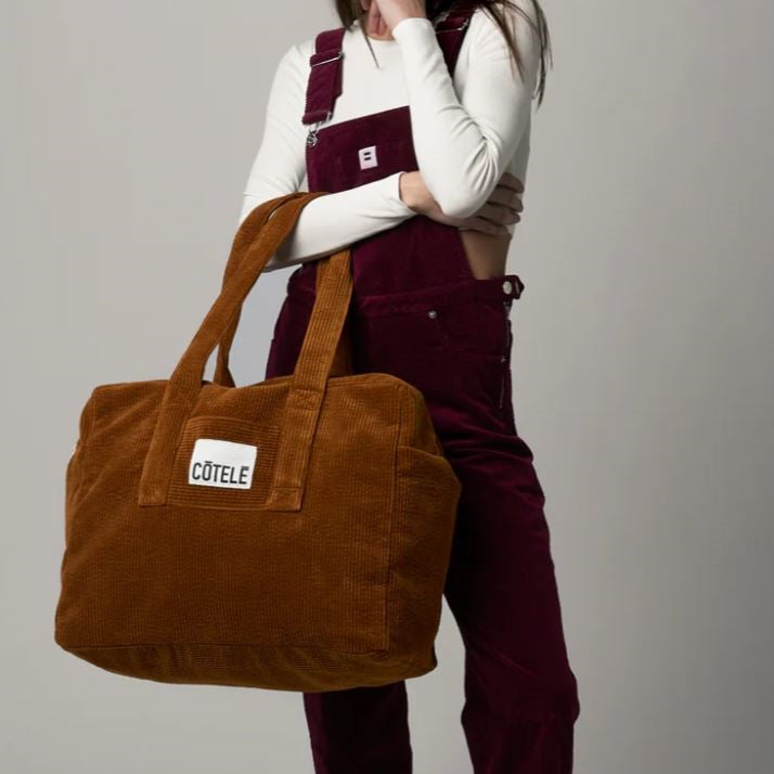 Sac Weekend en velours côtelé CAMEL. Idéal pour partir quelques jours. Composé de velours de coton 100% biologique tissé en France, doublure en toile de coton et poche intérieure.