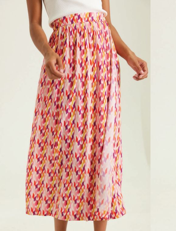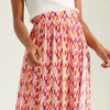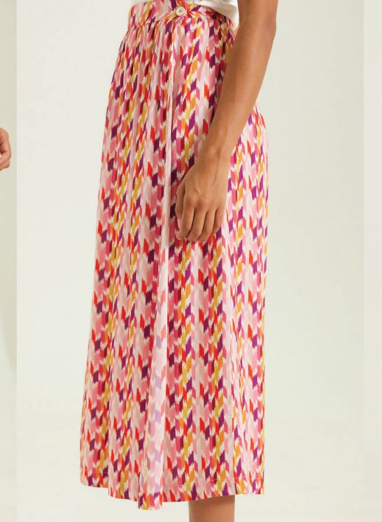 Jupe midi portefeuille à imprimés colorés, idéal pour l'été avec un top blanc qui met en valeur ces couleurs.