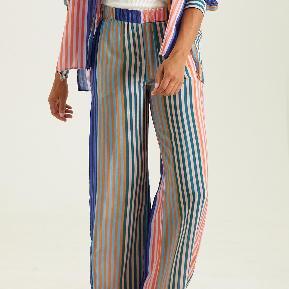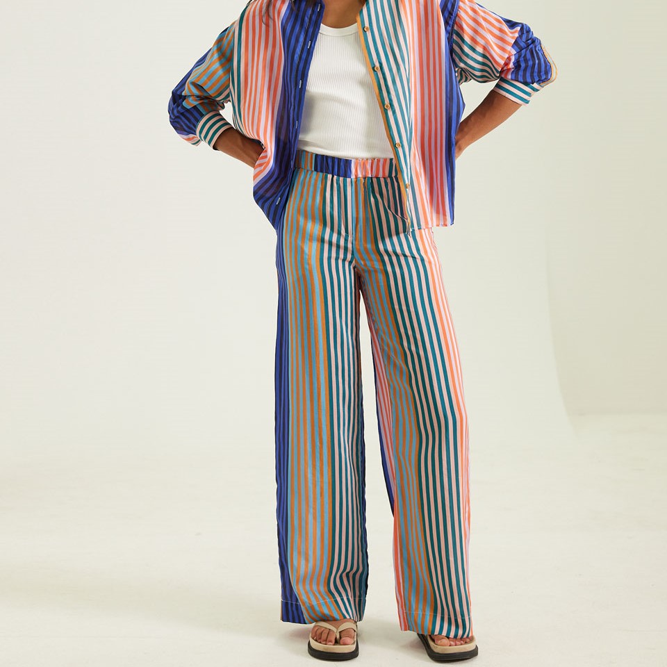 La coupe : Pantalon taille normale, ceinture élastiquée, coupe droite et large, poches italiennes devant.