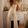 Salopette en Jean. Elle se ferme sur le devant avec un zip en métal doré. On adore ses jambes patte d'eph ! 2 Poches plaquées devant et dos nu.