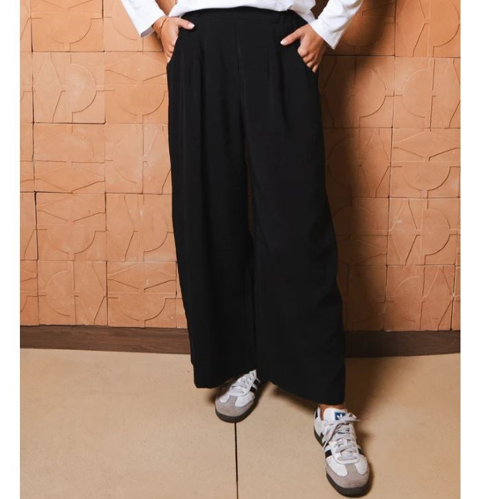 Le pantalon large JULIO souligne délicatement la taille, avec sa ceinture plate et ses passants.