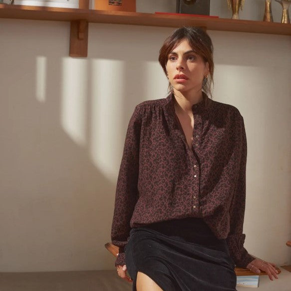Chemise Lily en double gaze de coton 100 %, imprimée léopard chocolat. Douce et fluide, elle séduit par son col officier froncé, sa coupe droite et son boutonnage pression. Une pièce wild et cosy, parfaite pour l’automne-hiver. Fabriquée au Portugal, certifiée Oeko-Tex.