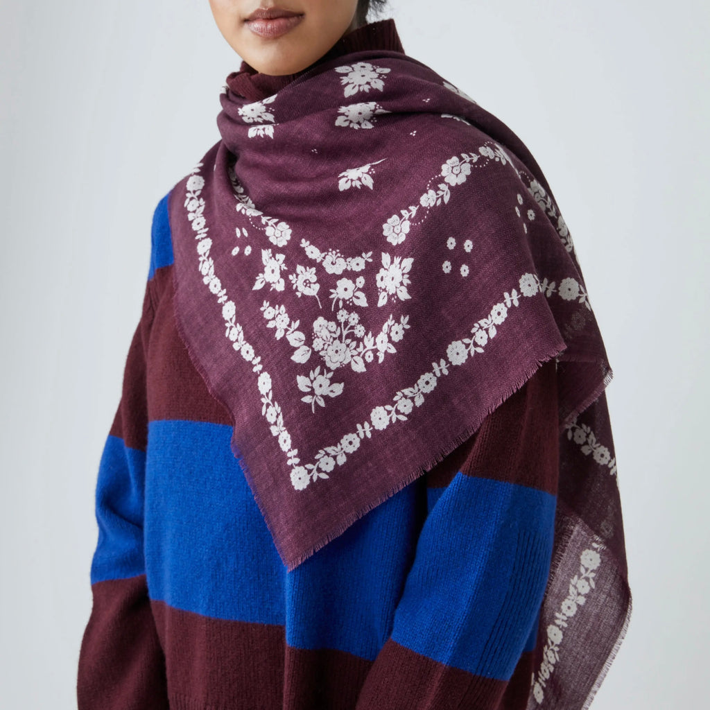 Tissé à la main dans une laine douce et légère, il affiche un motif floral contrastant, inspiré des bandanas traditionnels. Sa forme carrée de 90 x 90 cm permet de le porter de multiples façons. Facile à nouer autour du cou, il se distingue aussi par sa signature imprimée "MOISMONT", subtile touche finale qui affirme son identité.