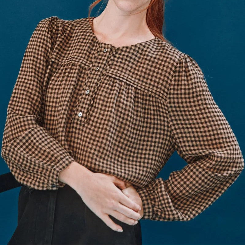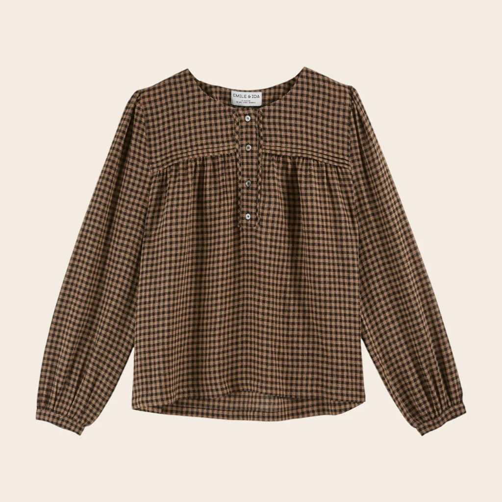 Blouse évasée en viscose et laine chocolat et noir (70 % viscose, 30 % laine). Encolure ronde, empiècements devant et dos avec plis religieuses, patte de boutonnage bordée de biais et manches longues resserrées par manchettes boutonnées. Boutons en nacre naturelle.