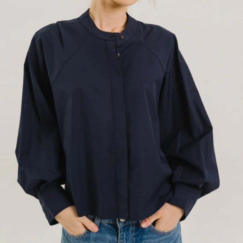 Blouse courte en viscose fluide. Ses manches raglan amples, subtilement structurées par un pli au poignet, apportent volume et légèreté à la silhouette.