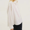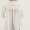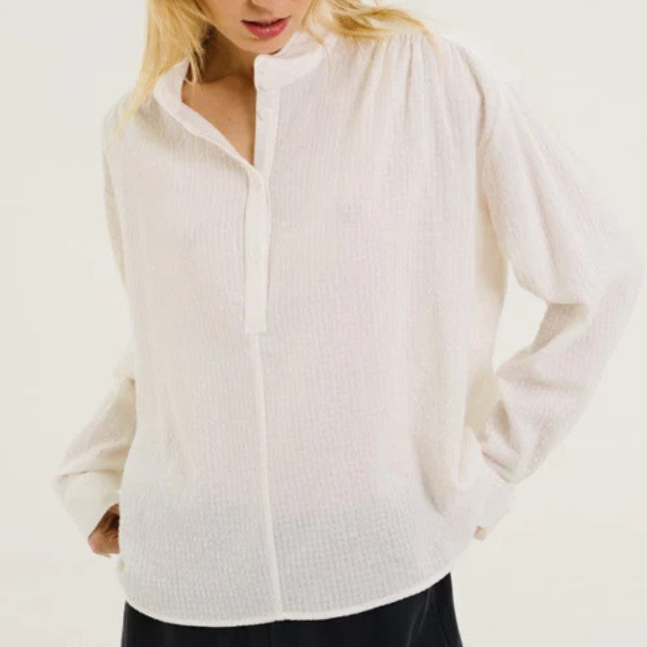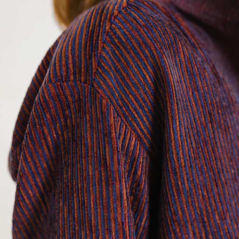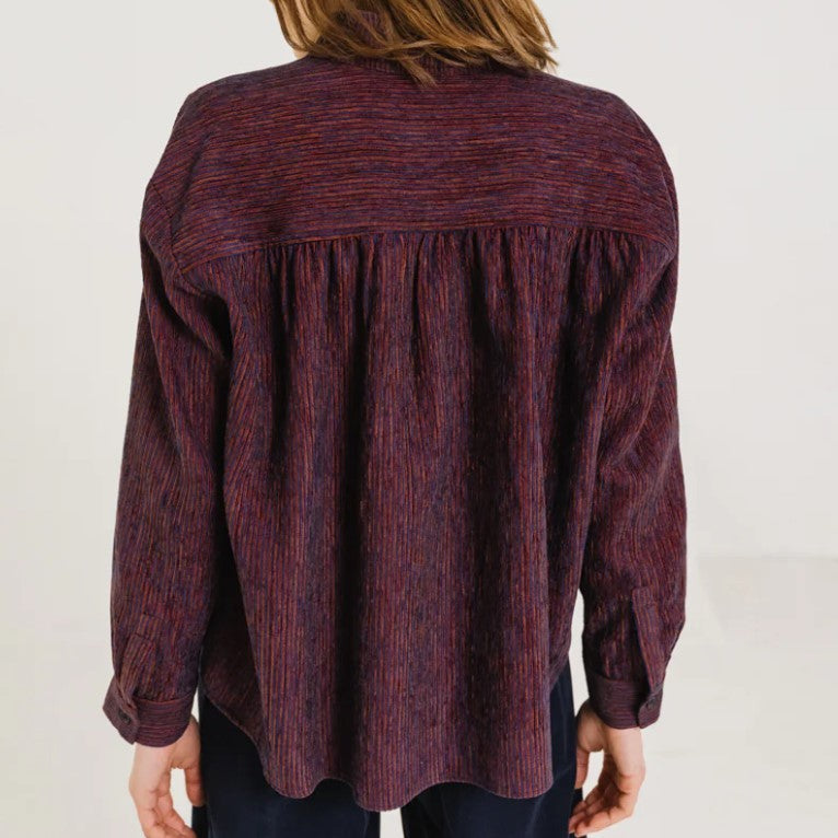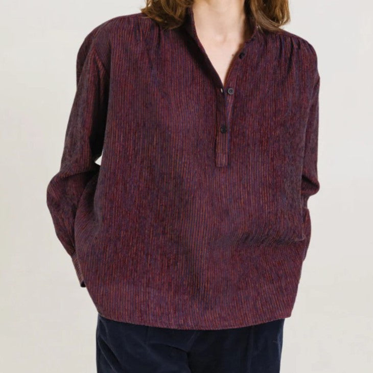 Blouse à col montant en velours rayé aux nuances de rouge et de bleu, également disponible en écru. Sa coupe ample et ses emmanchures basses offrent une silhouette fluide et décontractée, tandis que les fronces à l’avant et au dos ajoutent du mouvement et du caractère. Une patte polo délicate et des bas de manches fermés par un bouton apportent une finition subtilement féminine et raffinée.
