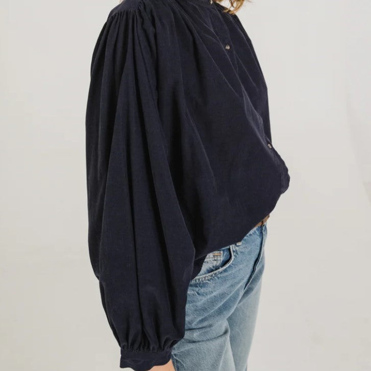 Blouse unie à manches longues, confectionnée en coton bleu marine profond. Sa coupe ample et fluide est rehaussée d’un col mao délicat et de fronces subtilement placées à l’avant, au dos et aux poignets. Les manches bouffantes apportent volume et légèreté, tandis que les poignets boutonnés apportent une finition soignée et féminine.