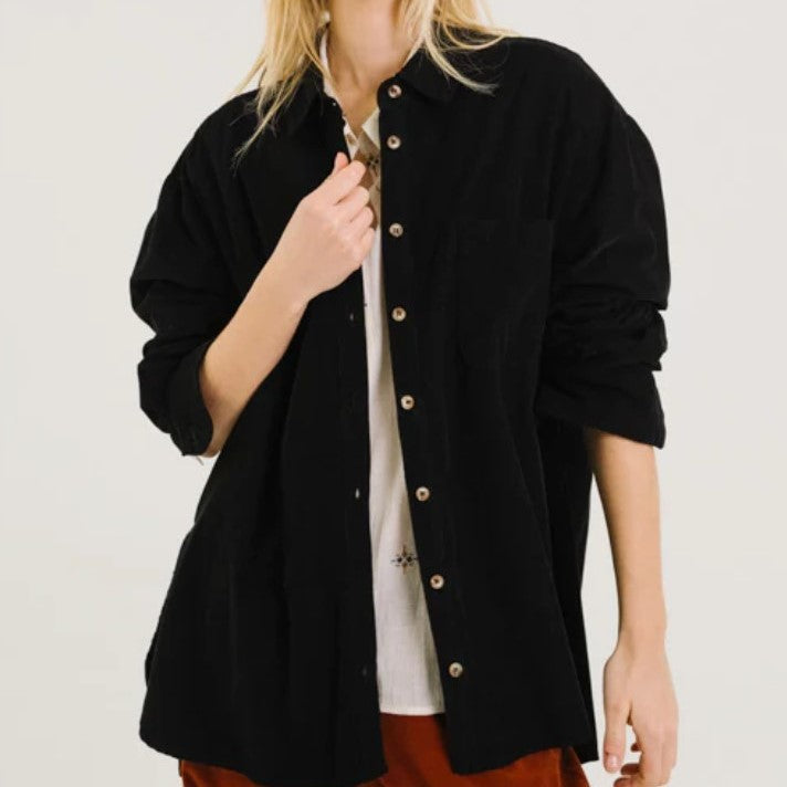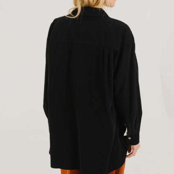 Chemise longue façon tunique, confectionnée en baby velours de coton noir au toucher doux et velouté. Sa coupe fluide se caractérise par un dos subtilement allongé, des fentes côtés et un double pli au dos qui apportent amplitude et confort. Agrémentée d’un col classique et d’une poche poitrine, elle combine chaleur, aisance et élégance décontractée dans une pièce au charme intemporel.