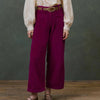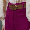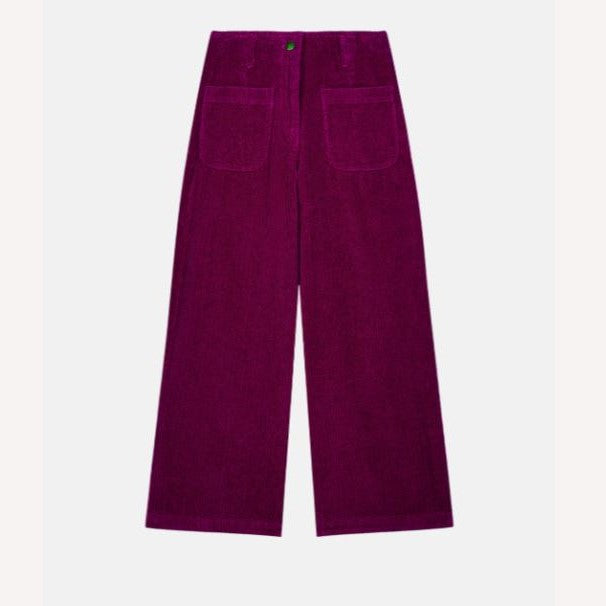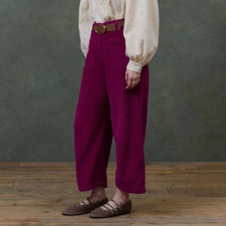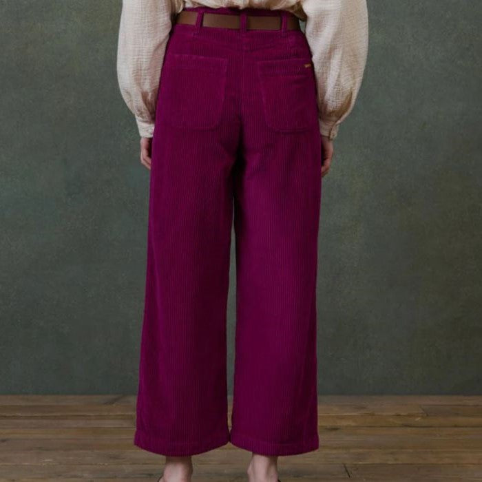 Pantalon droit en velours côtelé fushia. Sa taille haute et jambes droites allongent la silhouette et assure un confort pour un usage quotidien.