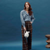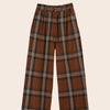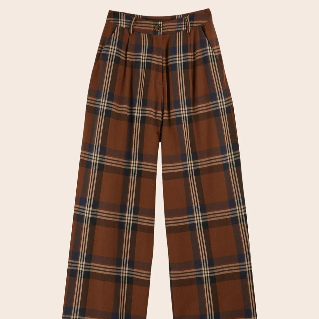 Pantalon large en coton recyclé chocolat à motif quadrillé blanc et noir. Taille haute avec ceinture à passants, fermeture zip et bouton, deux poches italiennes et deux poches raglan. Chaque pièce présente de légères irrégularités de tissage pour un charme unique.