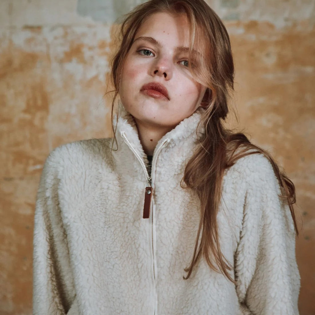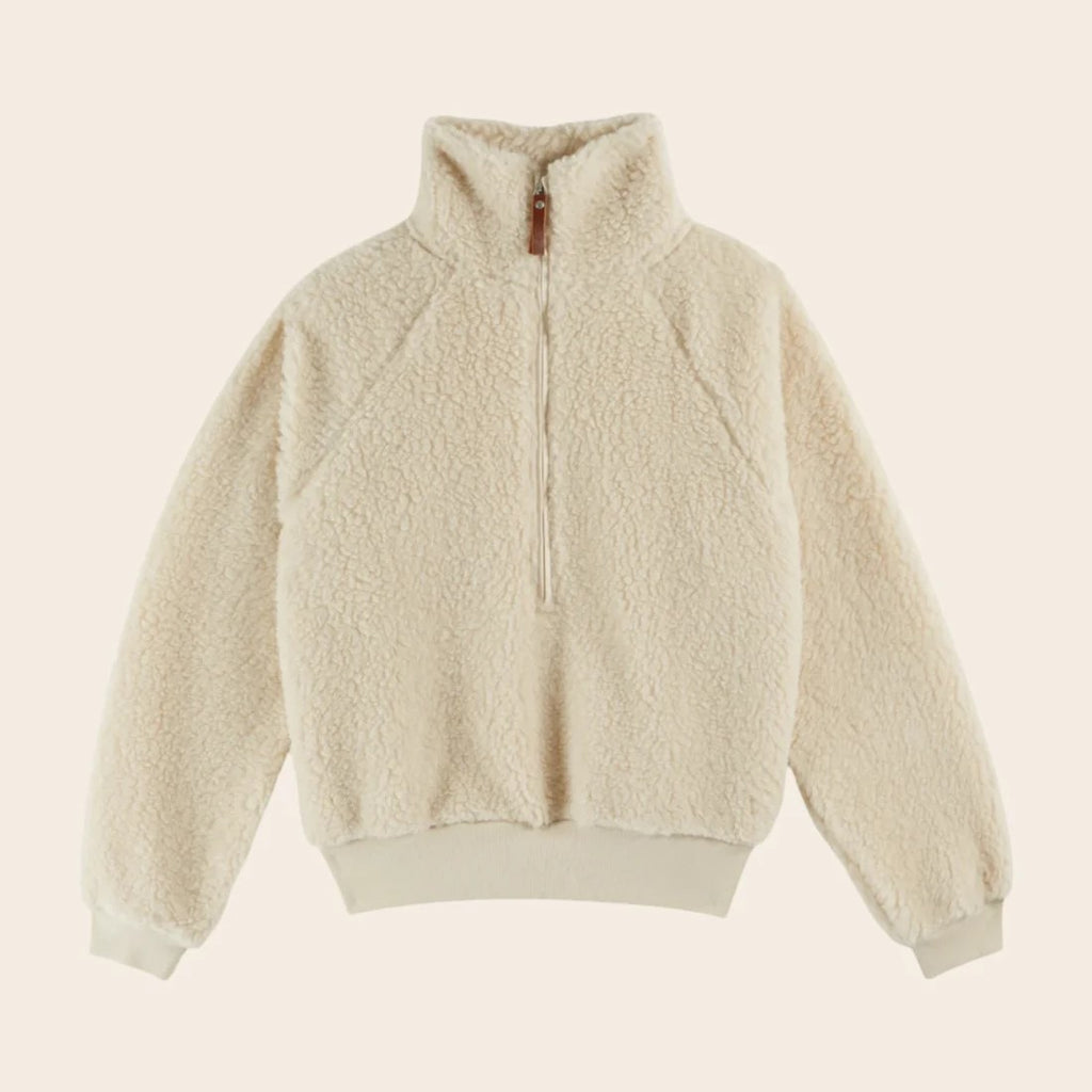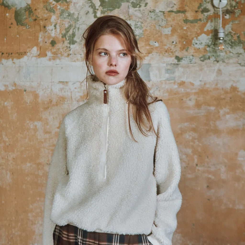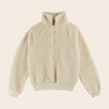 Sweatshirt zippé en laine mélangée écru (88 % polyester, 12 % laine vierge), doux et duveteux. Col camionneur, manches raglan et finitions en bord-côte ton sur ton pour un style casual et confortable.