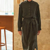 Robe longue en 100 % coton à imprimé vichy subtil. Coupe droite fluide, col officier, patte de boutonnage et découpes épaules. Ceinture à nouer et fente latérale pour un look élégant et décontracté.