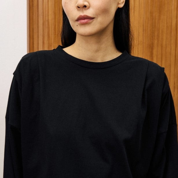 T-shirt à manches longues confectionné en coton doux, agrémenté de finitions travaillées au niveau des épaules qui apportent une touche subtile d’originalité et de style.