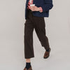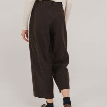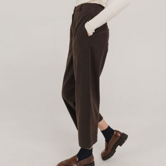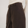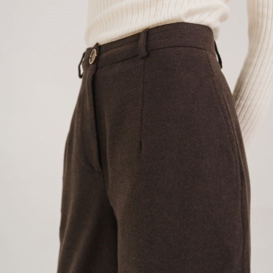 Pantalon style tailleur déstructuré coupe carotte et pinces à la taille. Tombé chevilles il assure un look preppy avec sa couleur choco et sa matière flanelle toute douce.
