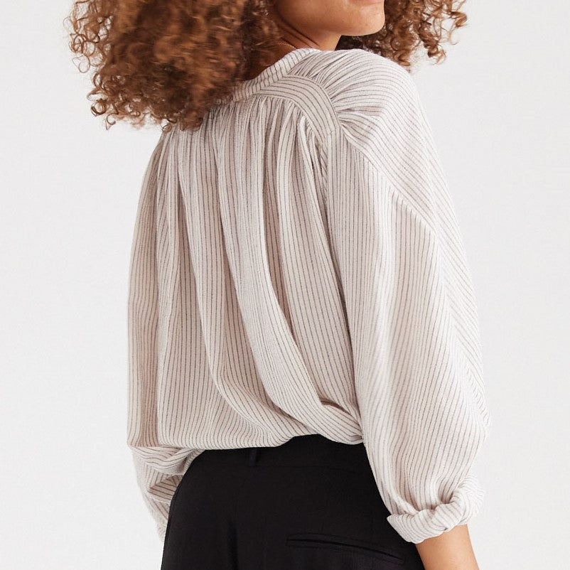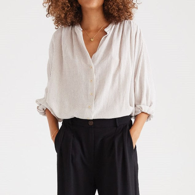 Blouse oversize avec boutonnage sur le devant. Empiècements aux épaules froncées sur le devant et le dos, manches longues, col droit.