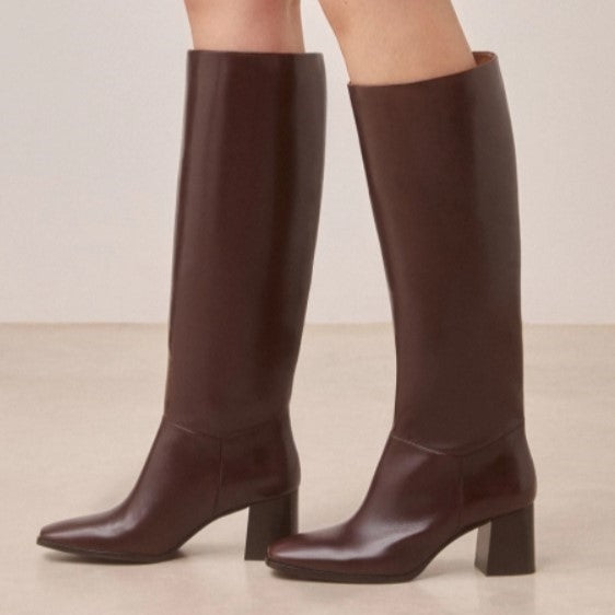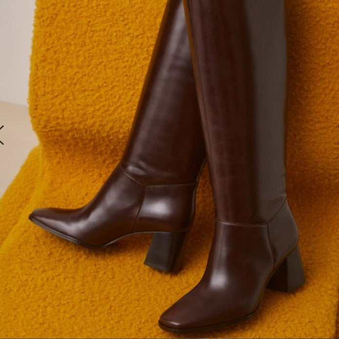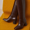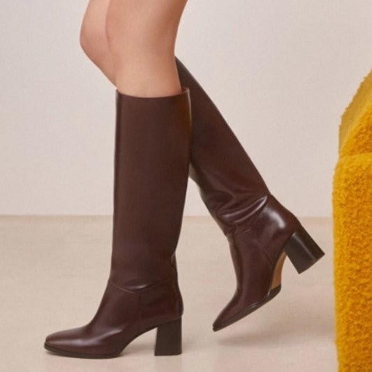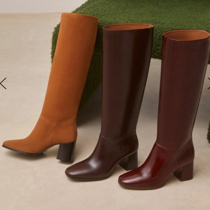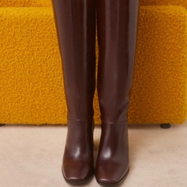 La botte 109 puise son inspiration dans les seventies. Avec son bout carré arrondi et son talon biseauté de 6 cm, elle allie style rétro et confort moderne.