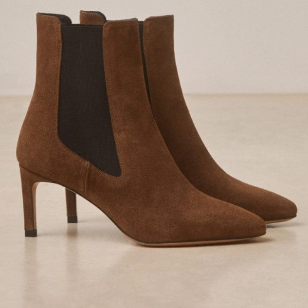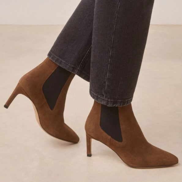 Bottine caméléon à enfiler, au bout pointu et talon de 7 cm, alliant confort et élégance. Sa coupe près de la cheville et son élastique contrasté structurent la silhouette tout en allongeant les jambes.
