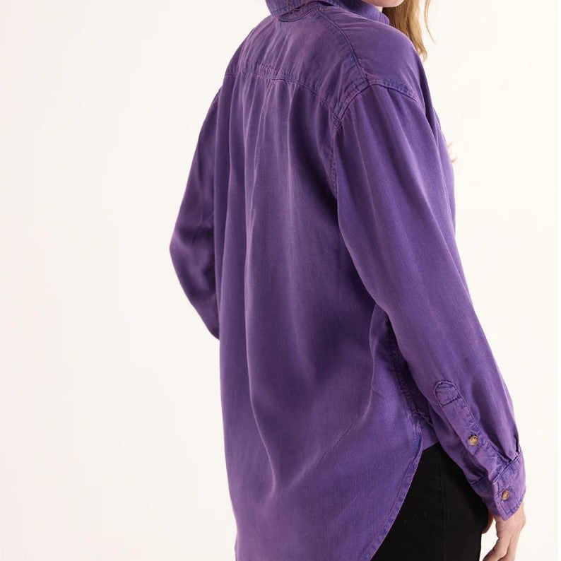 Chemise fluide manches longues. Inspiration chemise denim. Coupe très légèrement oversize. Emmanchure légèrement basse. Col chemise classique. Boutons apparents, patte capucin