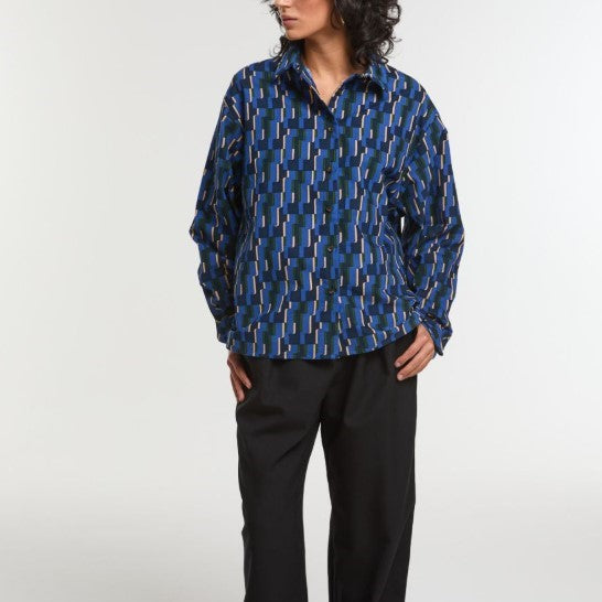 Chemise en velours de coton imprimé du motif Mystère, à la coupe droite et à la patte de boutonnage frontale. Dotée de boutons aux poignets et de légères fentes sur les côtés, elle allie confort et élégance.
