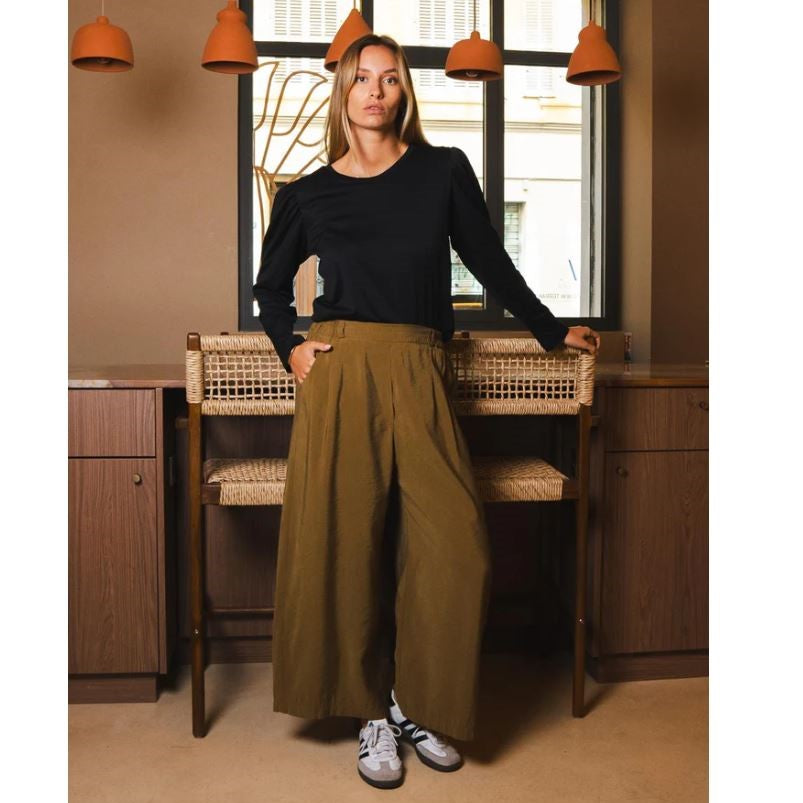 Le pantalon large JULIO souligne délicatement la taille, avec sa ceinture plate et ses passants.
