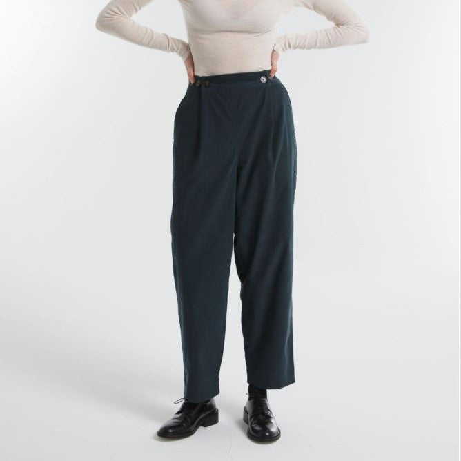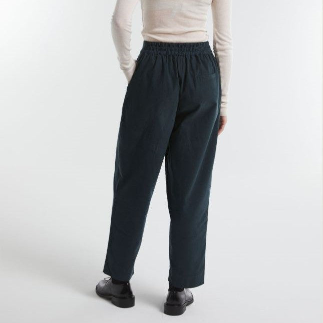 Pantalon taille mi-haute en velours de coton, coupe fuselée. Sa taille est ajustable grâce au dos élastiqué et au système de boutonnage à 3 niveaux.