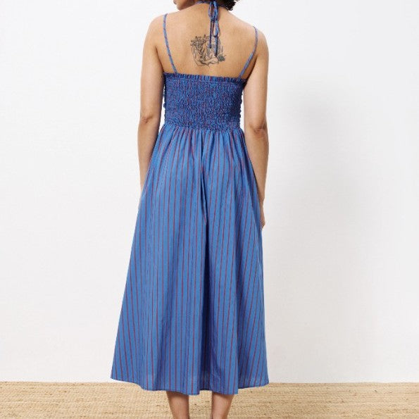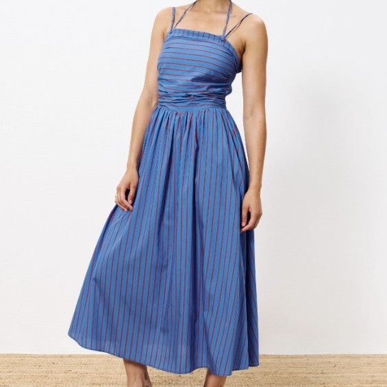 Craquez pour l'élégance légère de cette robe longue à rayures bleu et rouge, parfaite pour les journées ensoleillées ou les escapades estivales. Son drapé délicat sur la poitrine met en valeur le décolleté, tandis que le dos smocké assure confort et maintien. Les fines bretelles et le tissu fluide apportent une touche de légèreté irrésistible à cette pièce à la fois féminine et facile à vivre.