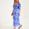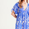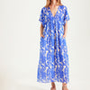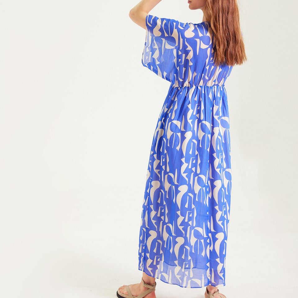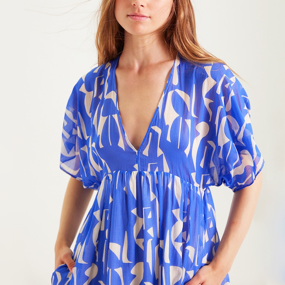 Robe longue manches courtes, coupe ample et fluide, imprimé bi color en crépon de coton. Taille élastiquée dos. Poche dans la couture. Jupe doublée.