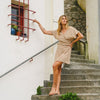 Le lien à nouer souligne la silhouette, décolleté en V met en valeur la ligne du cou avec finesse.