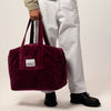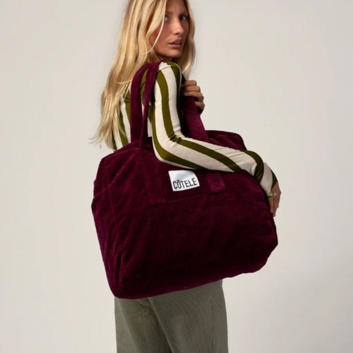 Sac Weekend en velours côtelé prune. Idéal pour partir quelques jours. Composé de velours de coton 100% biologique tissé en France, doublure en toile de coton et poche intérieure.
