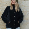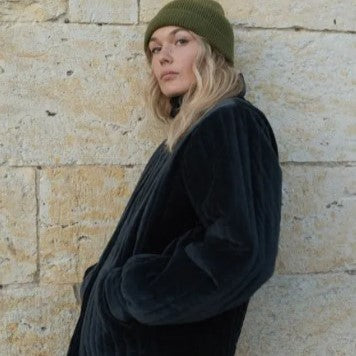 Manteau Rita en velours matelassé bleu indigo, doublé de fausse fourrure. Coupe courte casual, chaud et confortable, avec poches italiennes et boutons pression effet bronze vieilli. Un intemporel de mi-saison.